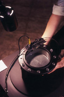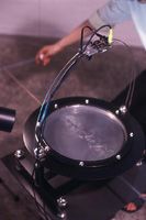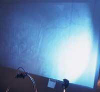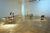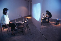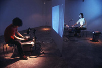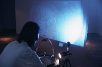 倉嶋さんは、2台のマシンから生まれるパターンをCCDカメラを使いリアルタイムにセンターのスクリーンへ両側から投影します。二つの現象のリアルタイムな映像によるインスタレーションです。