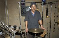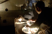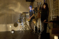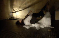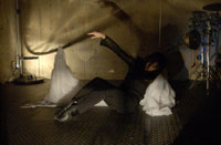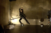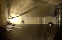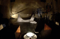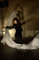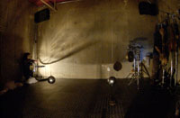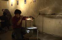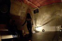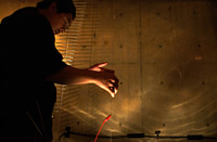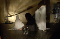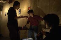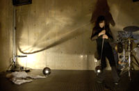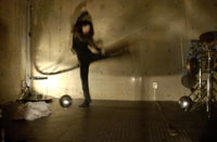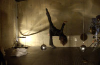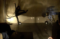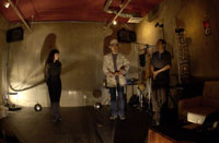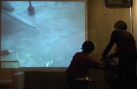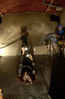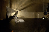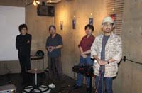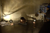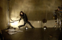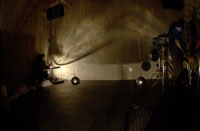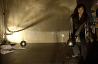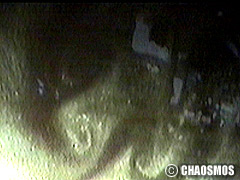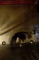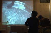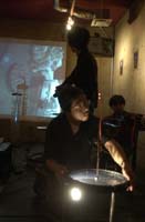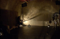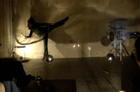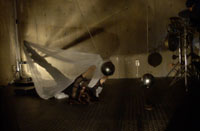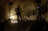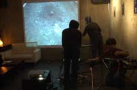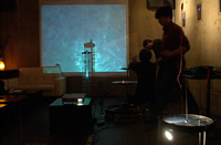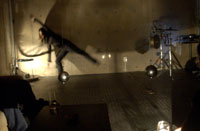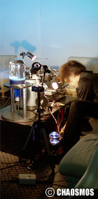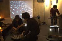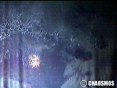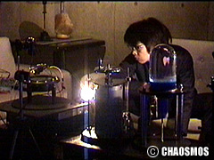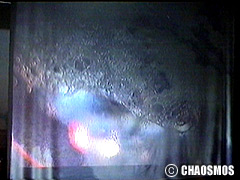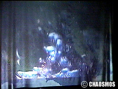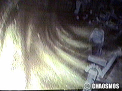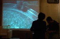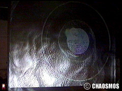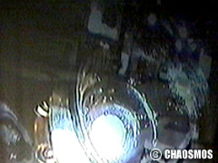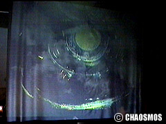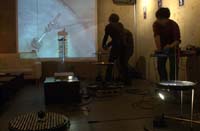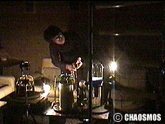 原田の奏作[そうさ]によりカオスモスマシンから生み出された複雑な現象(動き、乱流、振動)に対し、倉嶋はビデオカメラで撮影し、プロジェクターで壁面に拡大投影する、壁面に取付けられた光センサーが映像の光の明暗で米本マシンの音響を変化させる。倉嶋は撮影と同時にビデオカメラによる演奏を行なう事になる。米本は、独自の手法でカオスモスマシンの各部分に取り付けたコンタクトマイクで、原田が生み出す音及び振動を拾いあげ、倉嶋の映像による光センサーの信号と共に米本マシンで音響化し、PAから放出する。壁面の映像、PAからの音響に対し、原田はさらなる奏作[そうさ]を展開する。(文頭へもどる) |