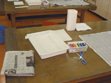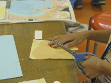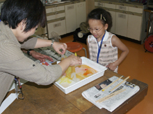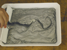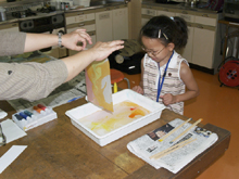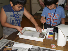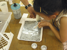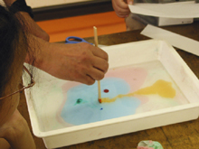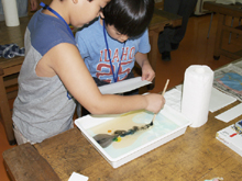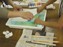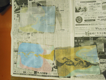 高木隆司先生の指導によりマーブリング液で渦を記録しました。 また、いろいろな渦のマーブリングをコラージュして造形表現しました。